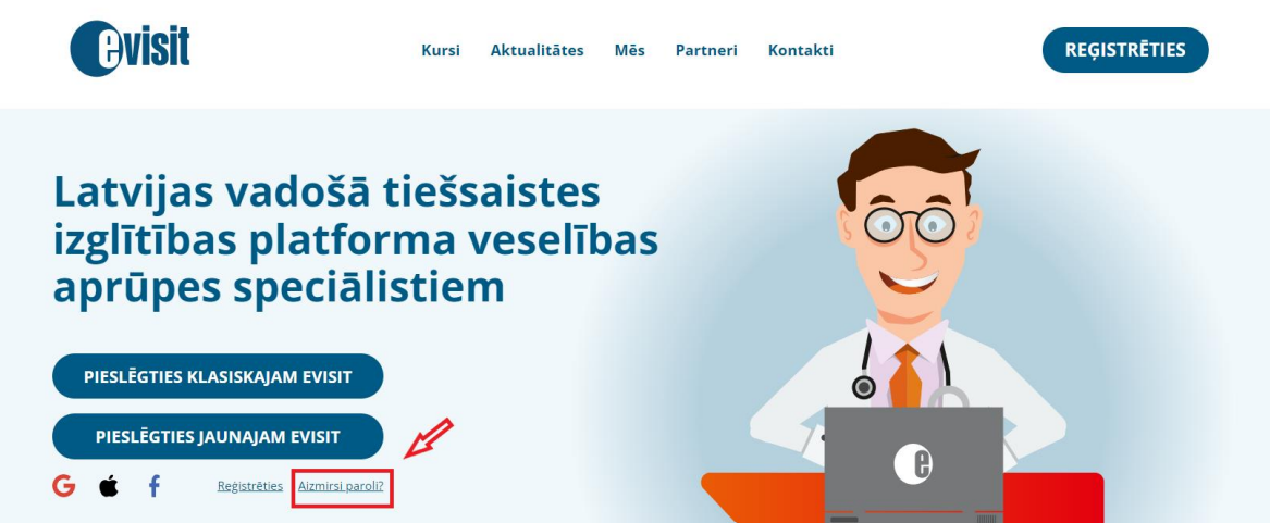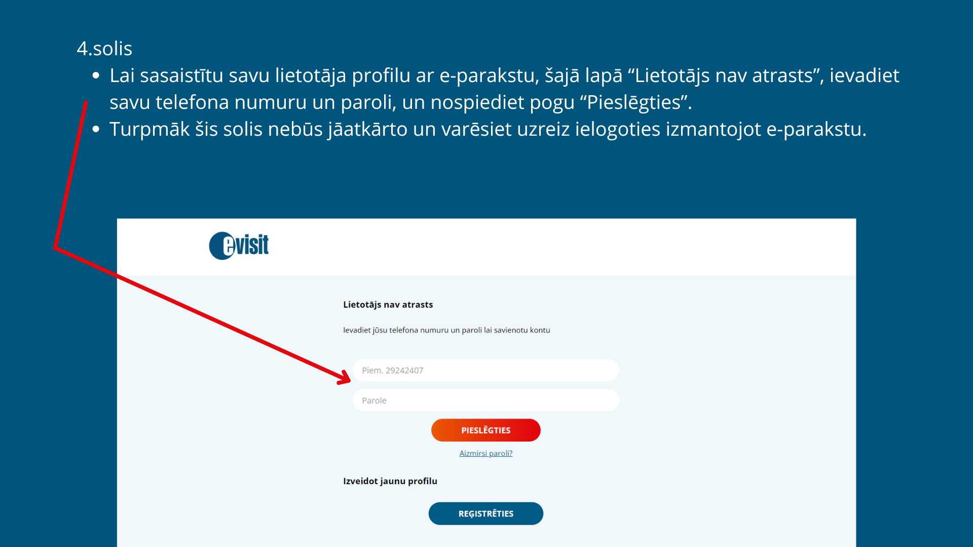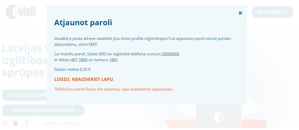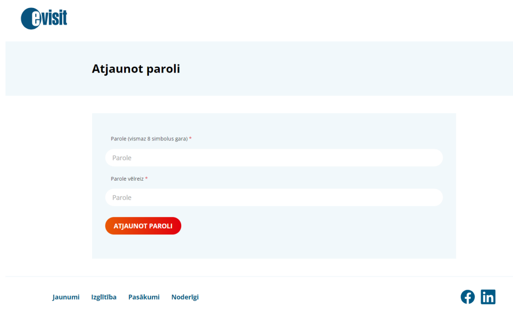 Gadījumā, ja esat aizmirsis paroli, dodieties uz saiti Aizmirsi paroli? Ievadiet savu tālruņa numuru un e-pastu, ar kuru reģistrējāties Evisit. Uz norādīto e-pastu atnāks ziņa no Evisit, kur būs informācija, kā rīkoties, lai izveidotu jaunu paroli.