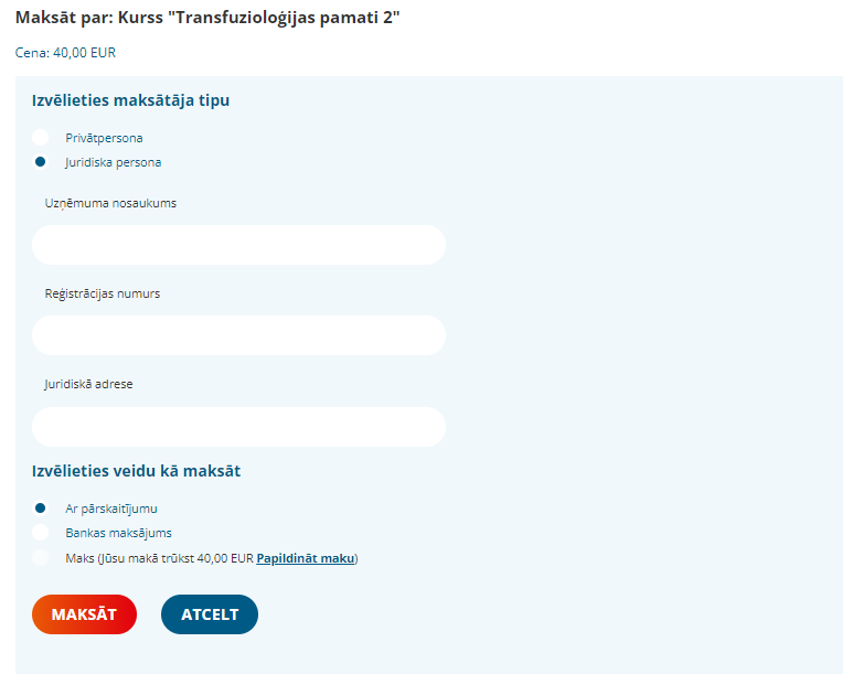 Veicot apmaksu, izvēlieties maksātāja tipu — Juridiska persona, ievadiet uzņēmuma rekvizītus un izvēlieties veidu kā maksāt — Ar pārskaitījumu. Jums tiks sagatavots rēķins apmaksai, kurš būs atrodams sadaļā Darījumi, kā arī nosūtīts uz Jūsu reģistrēto e-pastu. Sagatavojot rēķinu juridiskām personām, piekļuve mācību materiālam tiek nodrošināta 24h laikā no apmaksas brīža vai nākamajā darba dienā.