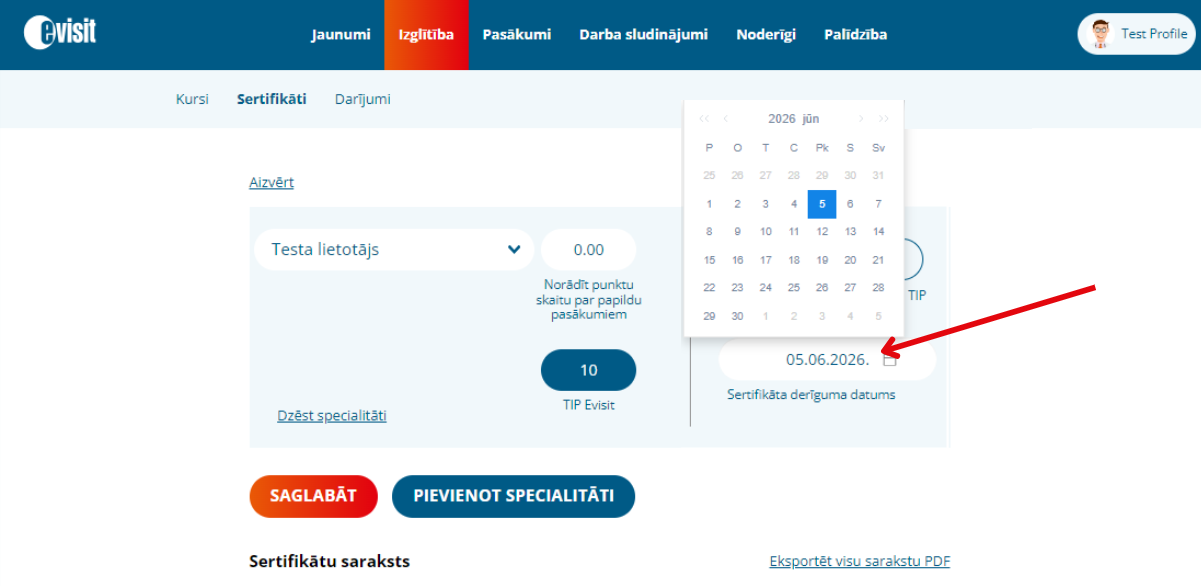 Ievadiet nākamo resertifikācijas datumu un spiediet uz pogas Saglabāt, lai apskatītu cik punktus vēl nepieciešams iegūt.